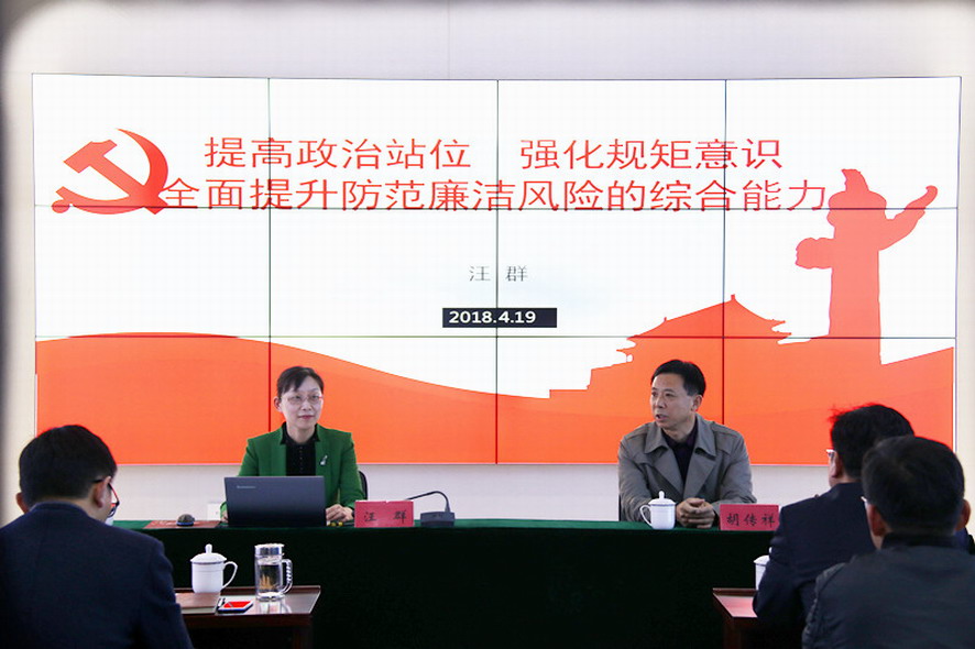 為進一步深入學習貫徹黨的十九大會議精神,強化正風肅紀,不斷鞏固拓展落實中央八項規(guī)定精神成果,4月19日下午,集團公司紀委書記汪群在資產(chǎn)管理公司上了一堂《提高政治站位,強化規(guī)矩意識,全面提升防范廉潔風險的綜合能力》廉政黨課,該公司50多名干部職工聆聽了黨課。