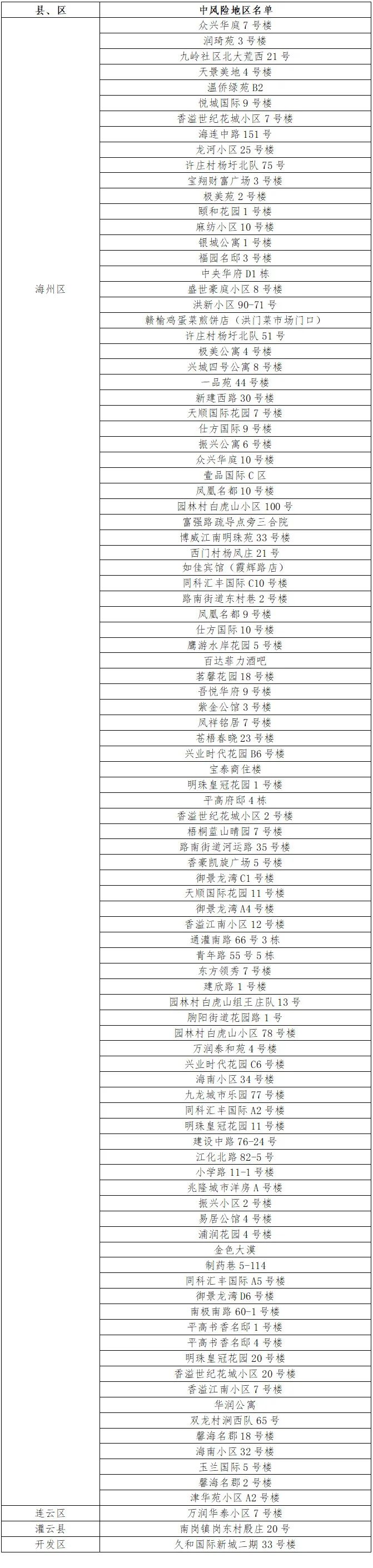 根據(jù)國務(wù)院聯(lián)防聯(lián)控機(jī)制有關(guān)規(guī)定,經(jīng)綜合評(píng)估研判,市指揮部決定,自發(fā)布之日起,將海州區(qū)明珠皇冠花園20號(hào)樓、香溢世紀(jì)花城小區(qū)20號(hào)樓、香溢江南小區(qū)7號(hào)樓、華潤公寓、雙龍村澗西隊(duì)65號(hào)、馨海名郡18號(hào)樓、海南小區(qū)32號(hào)樓、玉蘭國際5號(hào)樓、馨海名郡2號(hào)樓、津華苑小區(qū)A2號(hào)樓調(diào)整為中風(fēng)險(xiǎn)地區(qū)。