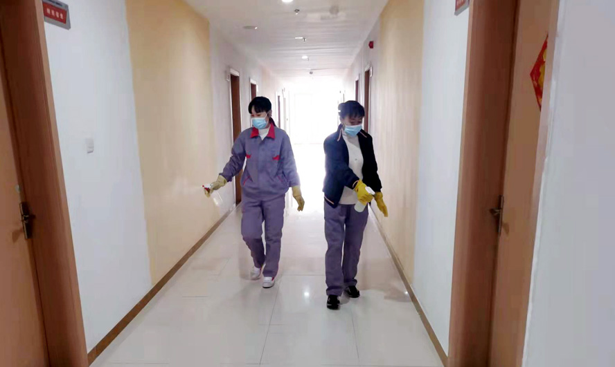 干凈整潔的辦公樓、宿舍樓里飄著淡淡的消毒水味道,清瘦干練的保潔員任禮勤正在仔細(xì)地打掃著樓道。5號(hào)疫情突發(fā)之時(shí)她正好當(dāng)班,根據(jù)以往疫情經(jīng)驗(yàn),她果斷地把一直照料著的年邁母親安排給了大哥,此后便堅(jiān)守在工作崗位上。疫情防控期間的工作量增加了不少,每天她和同事們分片作業(yè),在認(rèn)真做好各自清潔區(qū)每日兩次的保潔、消毒工作的同時(shí),還要負(fù)責(zé)就餐人員一日三餐的登記、測量體溫等工作。每天從早上7點(diǎn)開始,5位保潔員的身影便忙碌在公司的門廳、餐廳、樓道、電梯等場所,這一忙常常要到晚上6點(diǎn)多?!罢?qǐng)您量下體溫”“今天你做核檢了嗎”,這些溫馨的話語幾乎成了她們對(duì)大家的問候語。