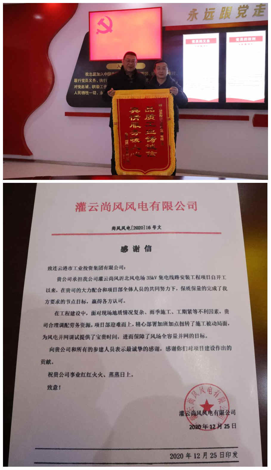 1月28日上午,灌云尚風(fēng)風(fēng)電有限公司副總經(jīng)理王現(xiàn)奇一行來(lái)到公司,授予我司一面錦旗和一封《感謝信》,以感謝半年來(lái)我司在灌云尚風(fēng)沂北風(fēng)電場(chǎng)35kV集電線路安裝工程項(xiàng)目中做出的貢獻(xiàn)。