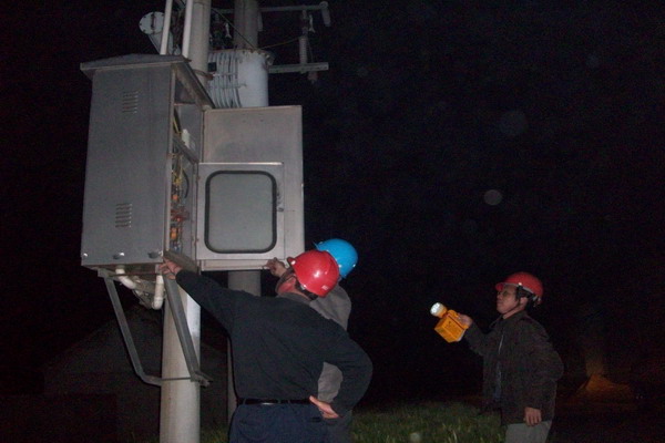 青口供電所為降低線損,采取多種措施消除線路和配變放電隱患。上圖為工人在夜間對設備進行檢查。(宋中文)