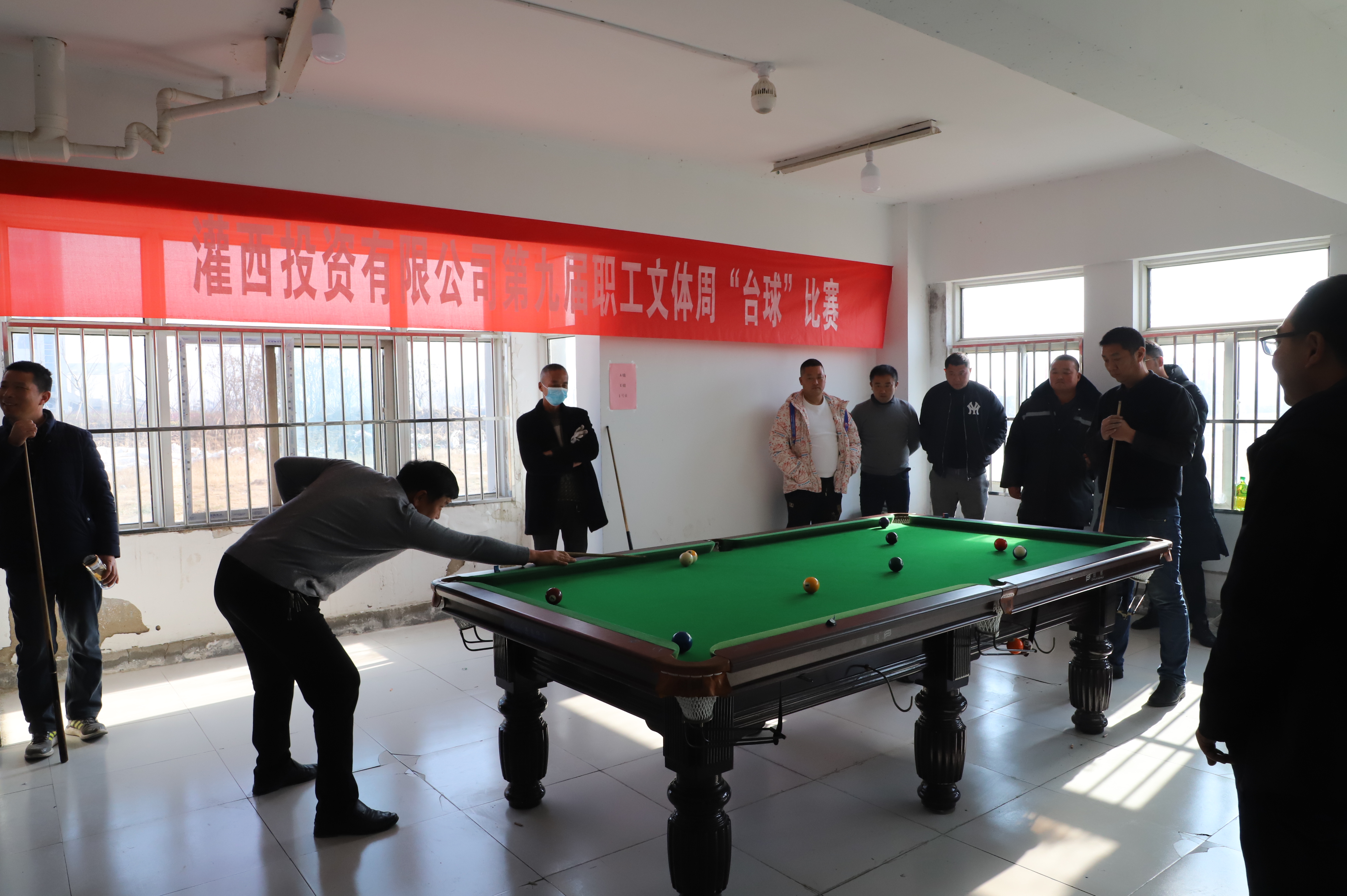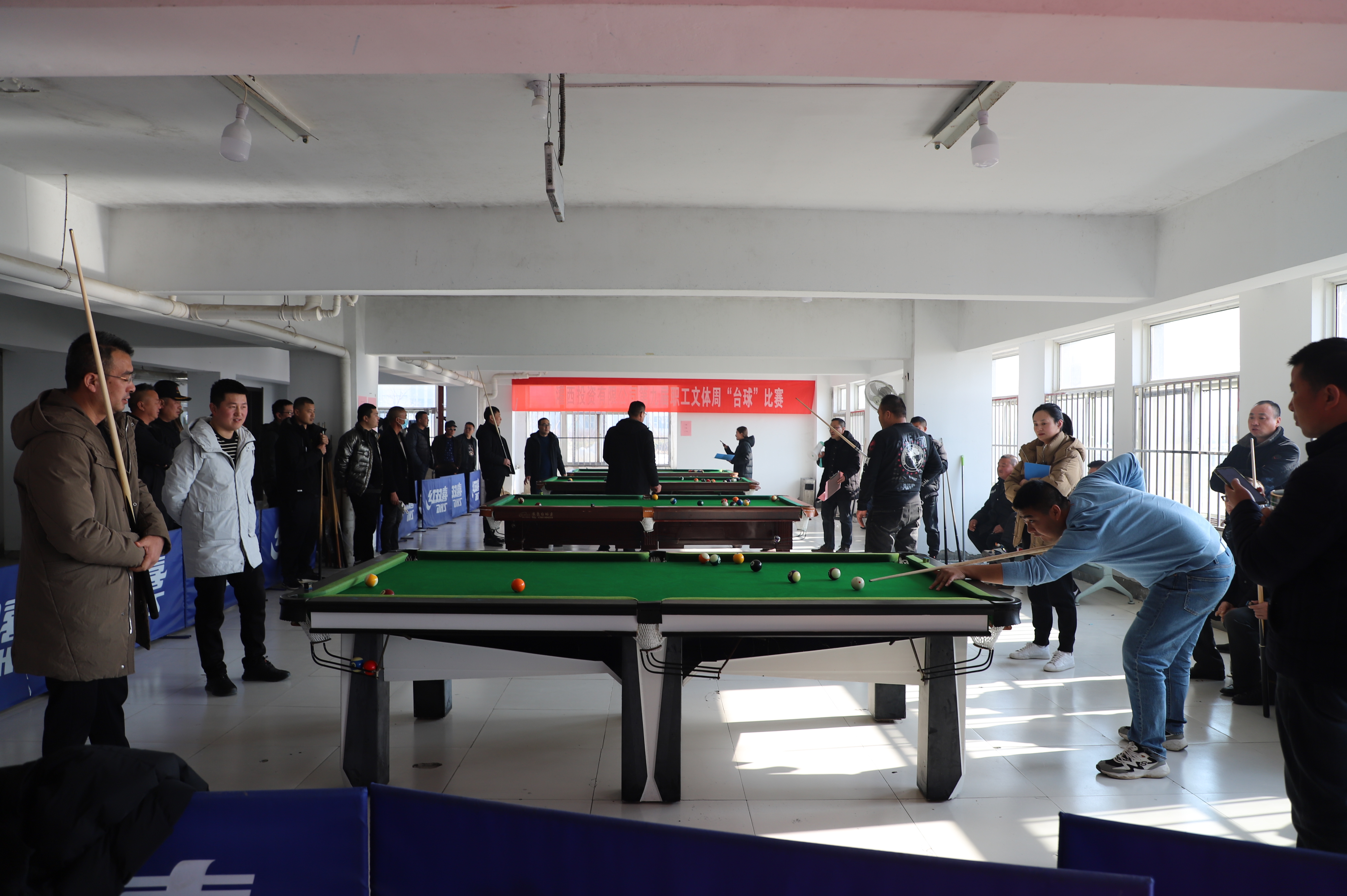 12月21日下午,臺球比賽在裁判員一聲令下正式開始,來自各個單位56名選手,分為8組進行比賽,采取單循環(huán)淘汰規(guī)則,小組內進行逐對“廝殺”,小組前兩名出線。比賽過程相當激烈,有的眾多高手被分在一組,俗稱“死亡之組”,每個人臉色凝重,場外圍滿了觀眾;有的爆出“冷門”,去年獲得第一名的選手第一輪慘遭淘汰;有的選手比較緊張,洞門門口球都沒有打進。經(jīng)過激烈角逐,共有16名選手出線。