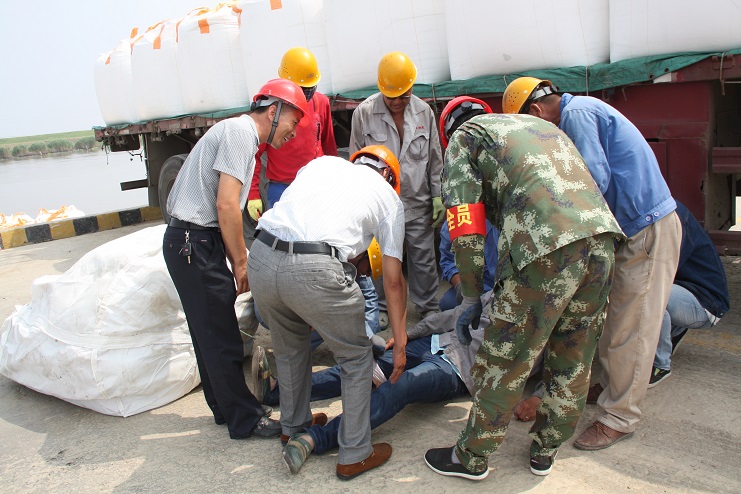在這次的安全演練中,投資公司運營監(jiān)管部部長李長軍主持了這次的安全演練活動,宵洋物流公司碼頭當班作業(yè)人員參與演練。在五灌河碼頭,正在吊裝的噸袋脫落,砸在一名操作人員的腿上,安全員王緒銀立即指揮停止作業(yè),作業(yè)現(xiàn)場安全負責人陸應(yīng)兵立即現(xiàn)場指揮人員現(xiàn)場施救,查看傷情,撥打120急救電話,同時向單位負責人沈志兵匯報。沈志兵及時趕到現(xiàn)場啟動應(yīng)急預(yù)案,疏散場地車輛,讓出120進場通道,命令救援小組展開緊急救援,并向公司運營監(jiān)管部和領(lǐng)導報告。在救援中,大家各司其職,齊心協(xié)力,配合默契,有條不紊成功完成了此次演練活動。通過這次應(yīng)急演練;進一步提高了公司員工在發(fā)生安全傷害事故時的現(xiàn)場處置能力和自救能力。