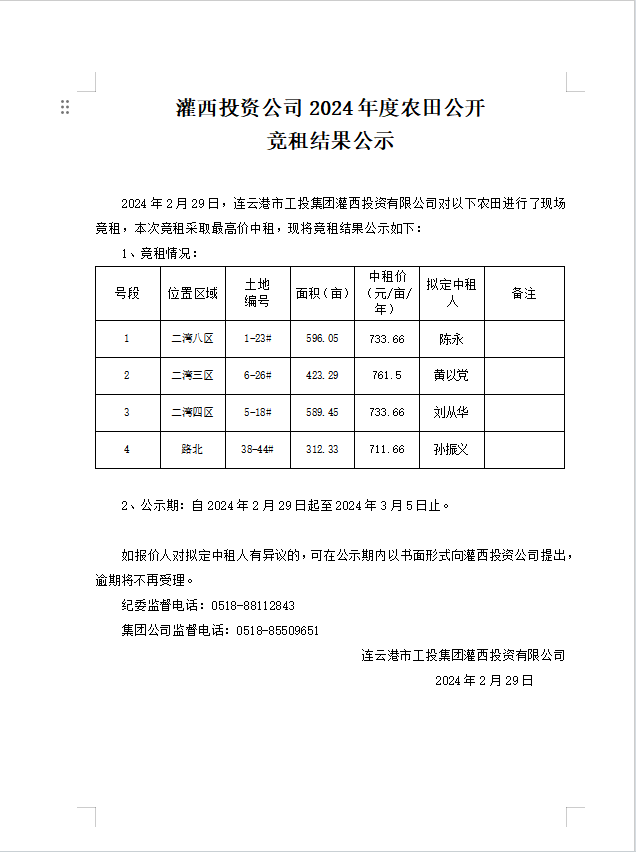 灌西投資公司2024年度農(nóng)田公開競(jìng)租結(jié)果公示