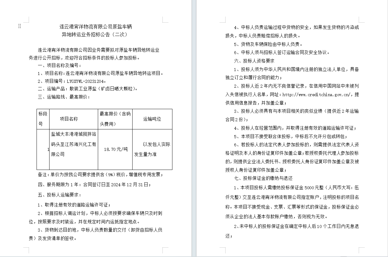 連云港宵洋物流有限公司原鹽車輛 異地轉(zhuǎn)運(yùn)業(yè)務(wù)招標(biāo)公告(二次)