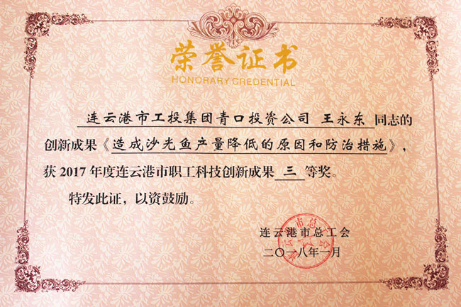 王永東經(jīng)多年摸索研究與實(shí)驗(yàn)總結(jié)出的《造成沙光魚產(chǎn)量降低的原因和防治措施》,曾在《北方水產(chǎn)》上刊登。公司工會(huì)收集資料,申報(bào)市職工科技創(chuàng)新項(xiàng)目。因該項(xiàng)技術(shù)成熟可靠,對(duì)沙光魚各種疾病愈后效果良好而得到認(rèn)可,最終獲得2017年度連云港市職工科技創(chuàng)新成果三等獎(jiǎng)。