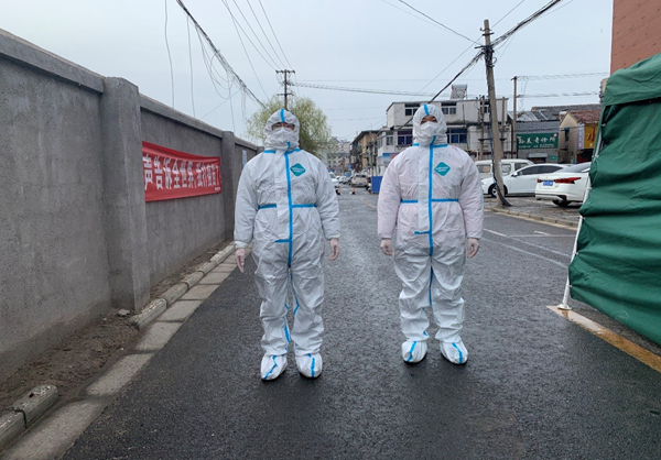 公司員工范益楊、李夢達是集團抗疫志愿隊的隊員。在冷冽寒風中,他倆身穿防護服挨家挨戶通知商戶暫停營業(yè),同樣的通知話語不厭其煩的重復著一遍又一遍,說得口干舌燥、疲憊不堪也未能阻攔他們繼續(xù)前進的腳步。