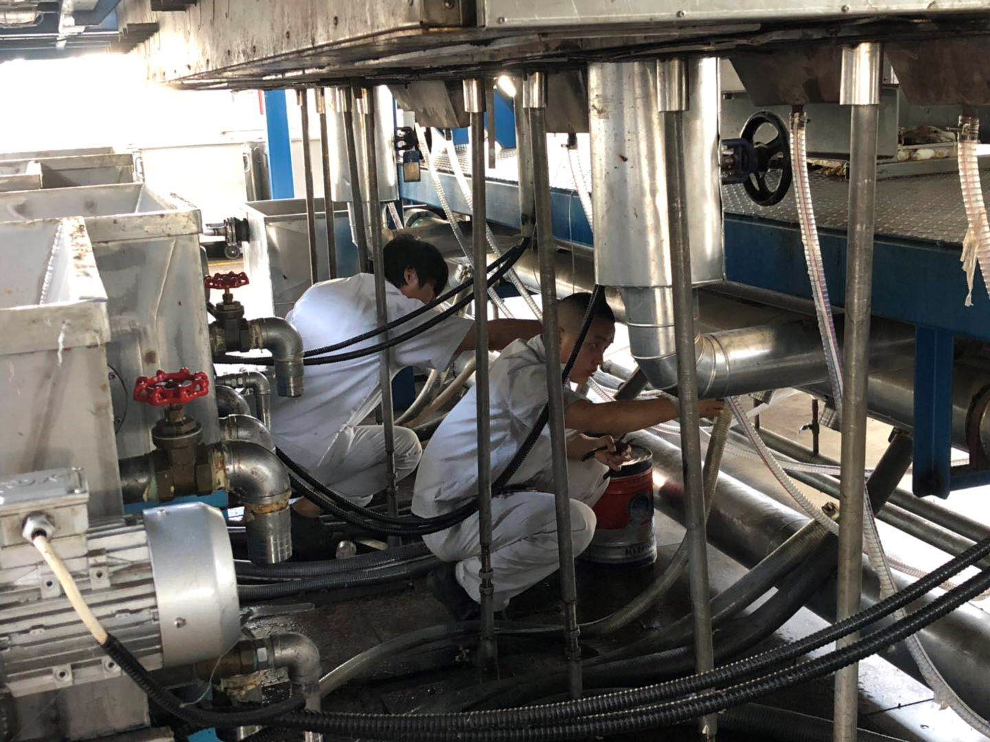 開(kāi)展生產(chǎn)線設(shè)備清理工作。后紡員工無(wú)懼炎熱天氣,擼起袖子加油干,面臨萃取機(jī)內(nèi)部空間狹小難清理難題時(shí),身材精瘦的員工爭(zhēng)相進(jìn)入萃取機(jī)內(nèi)部進(jìn)行清理作業(yè),形成“愛(ài)企奉獻(xiàn)”工作氛圍。