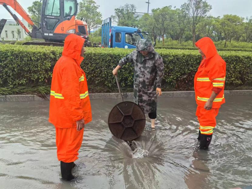 盛達(dá)市政分公司支委在“責(zé)任區(qū)”一線指揮,黨員沖鋒在前,24小時不間斷,在防汛一線筑牢“紅色城墻”,全力守護(hù)人民群眾生命財產(chǎn)安全。前后出動車輛設(shè)備10余輛,處理道路積水20余處,應(yīng)急開放閘9次,處理12345平臺案件100余件,應(yīng)急打開圍堰4處,24小時監(jiān)護(hù)新光和花果山涵洞,緊急處理公交站臺、交通標(biāo)志牌等城市家具傾倒7處;翔立分公司多次緊急“處警”,快速修復(fù)開太閘電路等多處電力故障,保障開發(fā)區(qū)泄洪秩序。