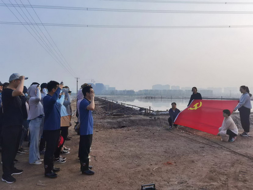 伴著朝陽,全體黨員在灘頭進(jìn)行了集體宣誓,重溫入黨誓詞。