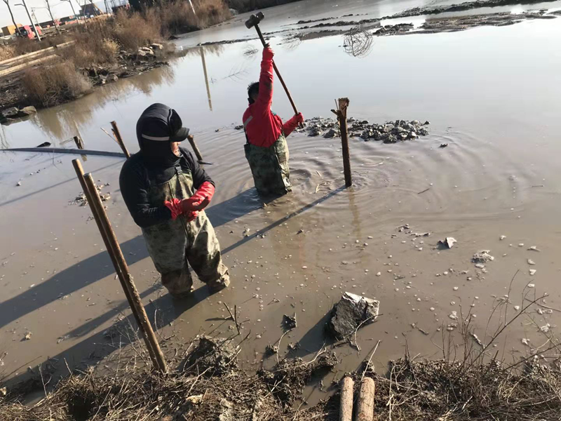 管道巡查發(fā)現(xiàn)通往堿廠(chǎng)的鈣液輸送管道因天氣影響爆裂損壞在送水道泥水中,搶修難度陡然增大。在困難前,我們干事豪情直面挑戰(zhàn)、創(chuàng)業(yè)激情燃燒嚴(yán)寒,穿上臃腫的防水皮衩深入到齊腰深的冰水中,卷起袖子雙手在水下摸索著對(duì)接管道,擰緊哈弗節(jié)上的每一根螺絲,接下來(lái)的打樁捆綁固定一切皆是那么的嫻熟。什么寒風(fēng)侵肌、冰澈透骨全然阻擋不住我們“鐵軍”干事創(chuàng)業(yè)的激情,鏗鏘有力的大錘不斷打下新一年的希望。