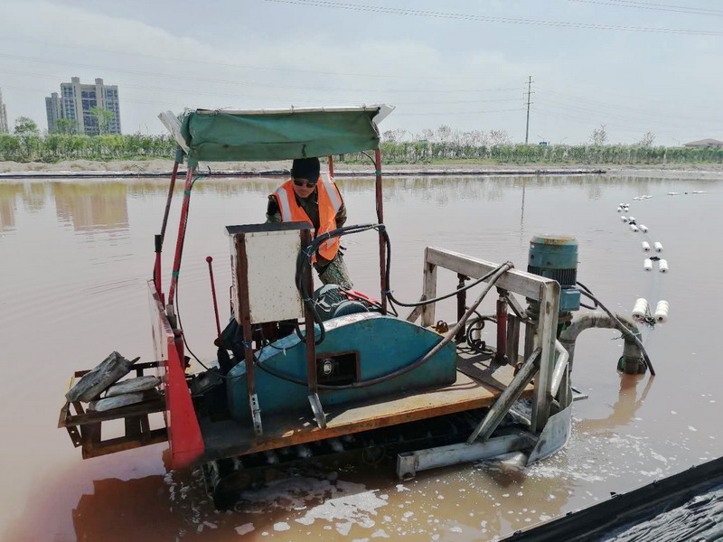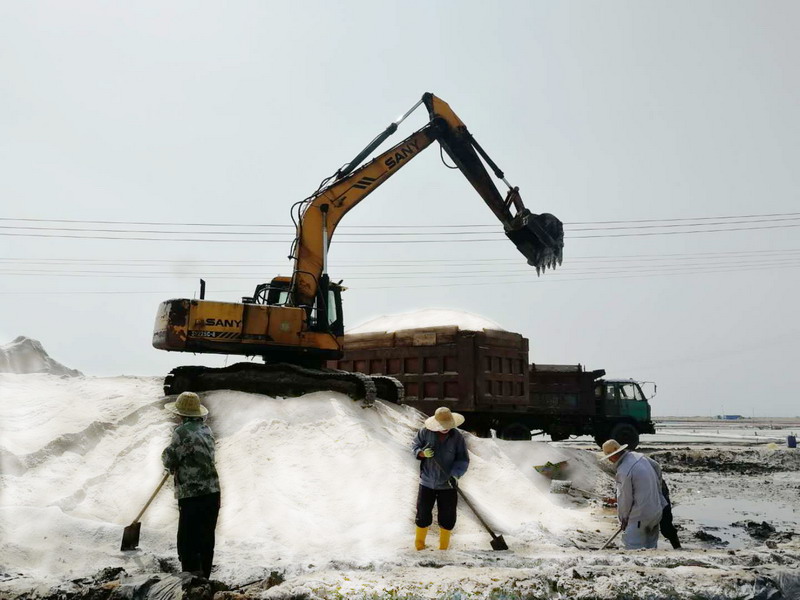 在大浦工區(qū),工長(zhǎng)劉天義說(shuō):“今年秋扒的任務(wù)重,加之最近幾天陰雨,耽誤了工期,國(guó)慶期間我們?nèi)糠艞壭菁?,今天早上收完塑苫布,只要天氣允許,我們馬上就轉(zhuǎn)入正常扒鹽工作.....”