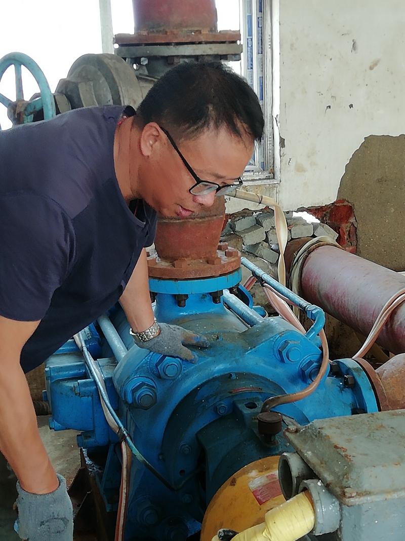 在徐圩運鹽河畔,玻璃鋼管道維修現(xiàn)場,發(fā)電機(jī)隆隆轟鳴聲中不時夾雜著角磨機(jī)刺耳的打磨音,所到之處風(fēng)塵飄揚。白色塵霧中,一名五十多歲的中年漢子正凝神專注的低頭操作,仔細(xì)的打磨著玻璃鋼管道接頭的每一片角落,絲毫不敢馬虎。不時,他摘下眼鏡取下戴在嘴上的防護(hù)口罩,鼓起腮幫用力吹去眼鏡上飄落的粉塵。顧不得擦一把額頭上的汗水,戴好眼鏡和口罩,調(diào)整好位置繼續(xù)俯下身打磨,他就是翔立分公司顧圩泵站班組長顧昌全。