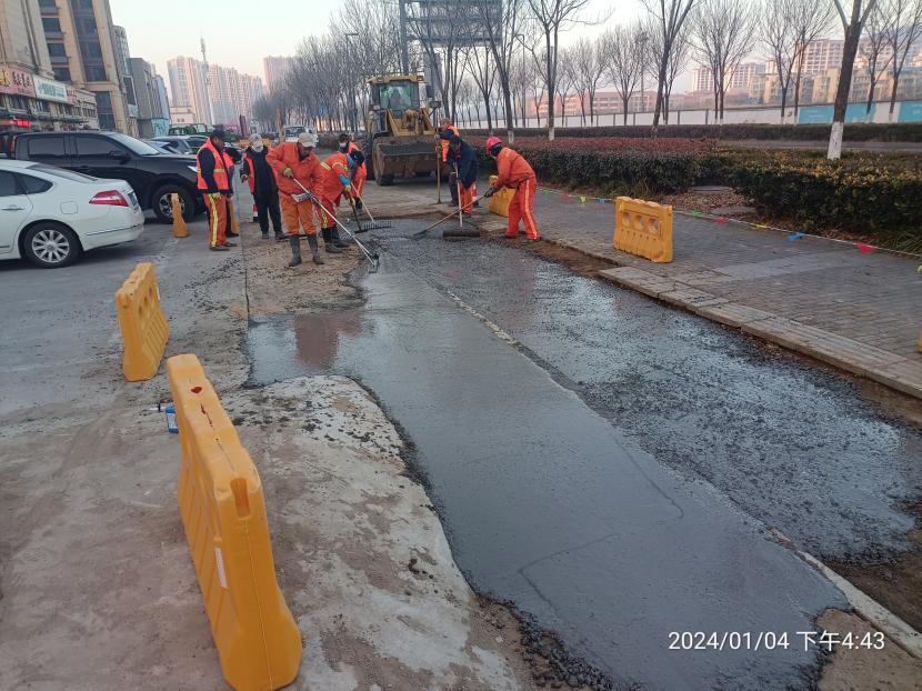 由于去年年底轄區(qū)平山路進行電路改造,對道路路面及人行道道磚造成破壞,給行人帶來通行不便和安全隱患,為此,盛達(dá)市政公司為及時恢復(fù)行人安全出行環(huán)境,對平山路開展整治工作。整治工作中,該公司根據(jù)工作實際情況,科學(xué)安排,精心部署,始終嚴(yán)把質(zhì)量關(guān),和天氣比賽,與時間賽跑,在供電部門完成電路改造后,第一時間進行破損路面清除、廢舊道磚拆除、布設(shè)圍擋等清障保通工作,于今年一月初進行測量放線、混凝土澆筑、道磚鋪設(shè)等工作,通過養(yǎng)護人員20余天的有序作業(yè),順利完成整治工作,并做好灑水覆蓋養(yǎng)護。